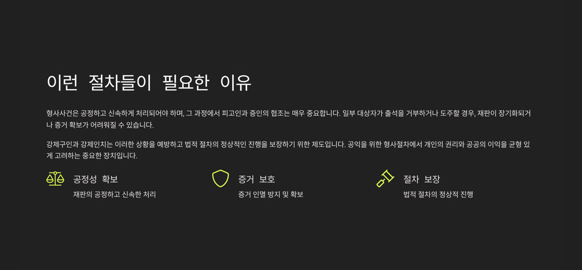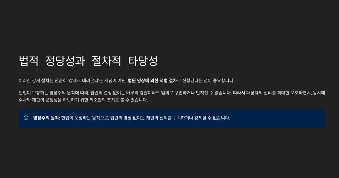 이러한 강제 절차는 단순히 ‘강제로 데려온다’는 개념이 아닌, 법원 영장에 의한 적법 절차로 진행된다는 점이 중요합니다. 헌법이 보장하는 영장주의 원칙에 따라, 법원의 결정 없이는 아무리 경찰이라도 임의로 구인하거나 인치할 수 없습니다.