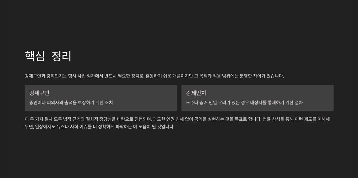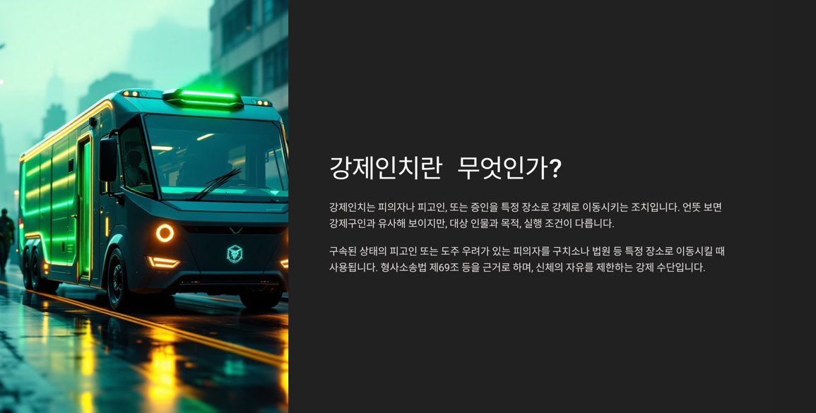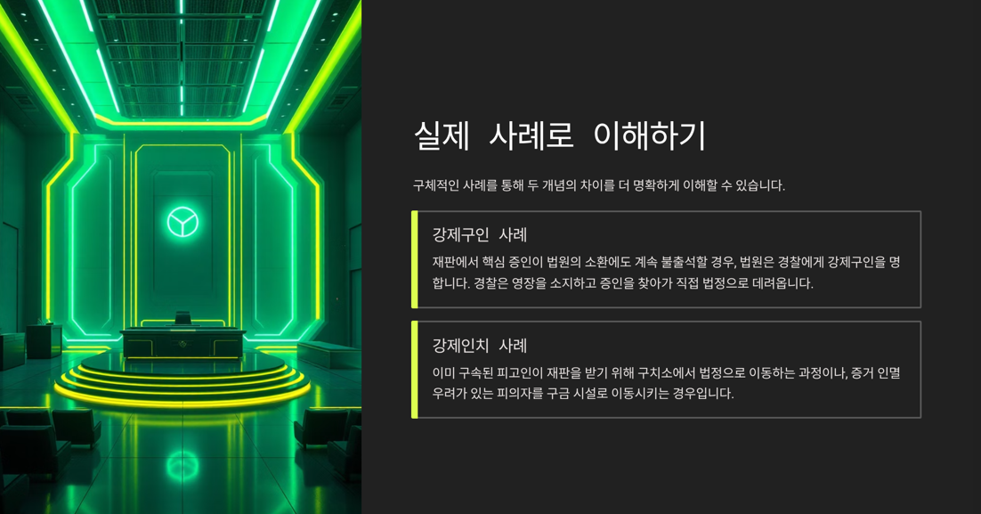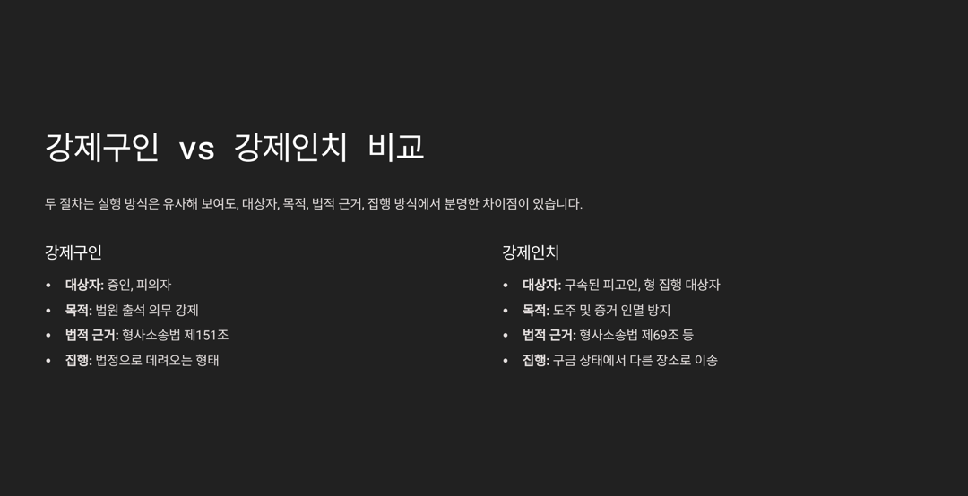 - 집행 방식 역시, 강제구인은 수사기관이나 경찰이 법정으로 데려오는 형태이고, 강제인치는 구금 상태에서 다른 장소로의 이송이 중심입니다.