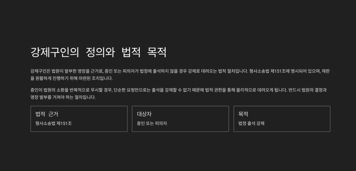 - 법적 근거도 다릅니다. 강제구인은 형사소송법 제151조를, 강제인치는 제69조 등 여러 규정에 기반하고 있어요.