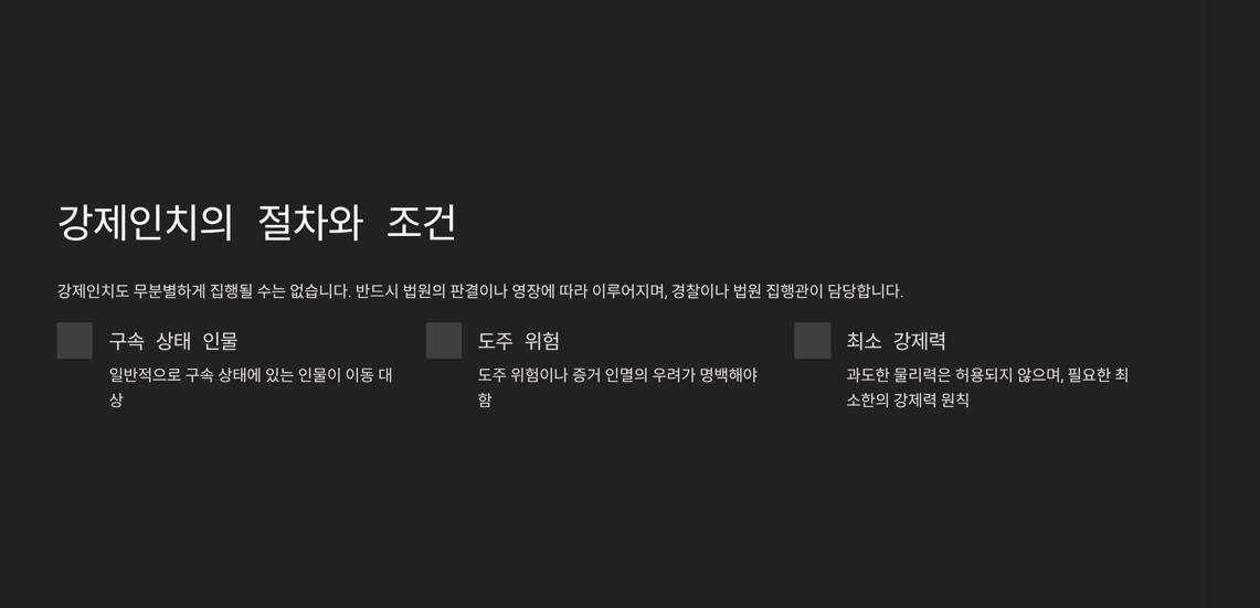 강제인치는 수사 및 재판의 흐름을 방해하지 않도록, 대상 인물을 통제하고 이동시키는 역할을 합니다. 이 과정에서도 마찬가지로 과도한 물리력은 허용되지 않으며, 필요한 최소한의 강제력이 원칙입니다.