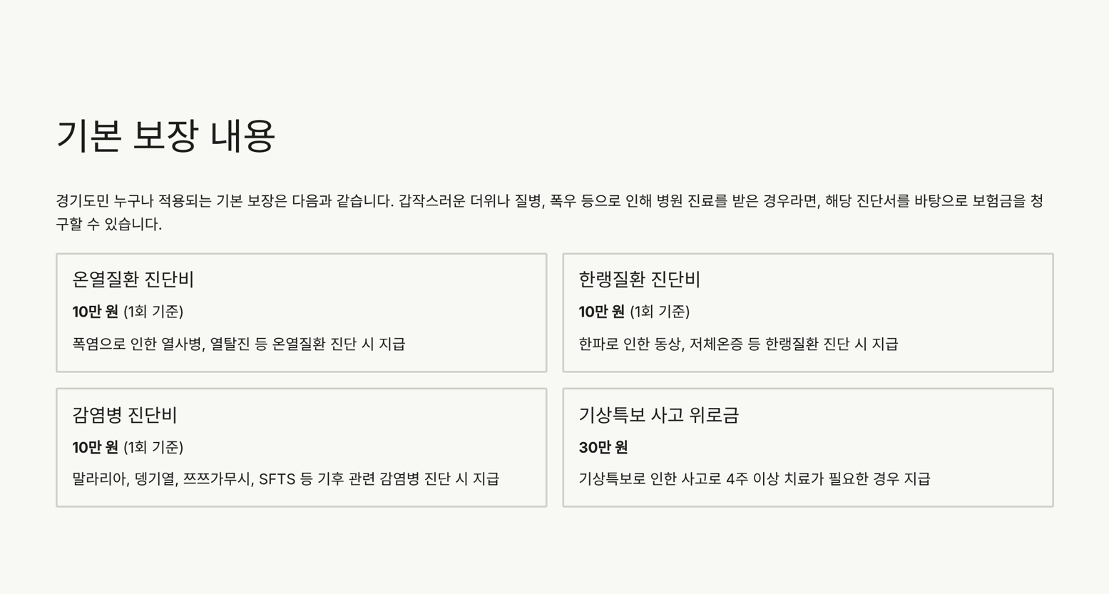 - 보장 범위: 온열/한랭질환, 감염병, 기상특보 피해 등