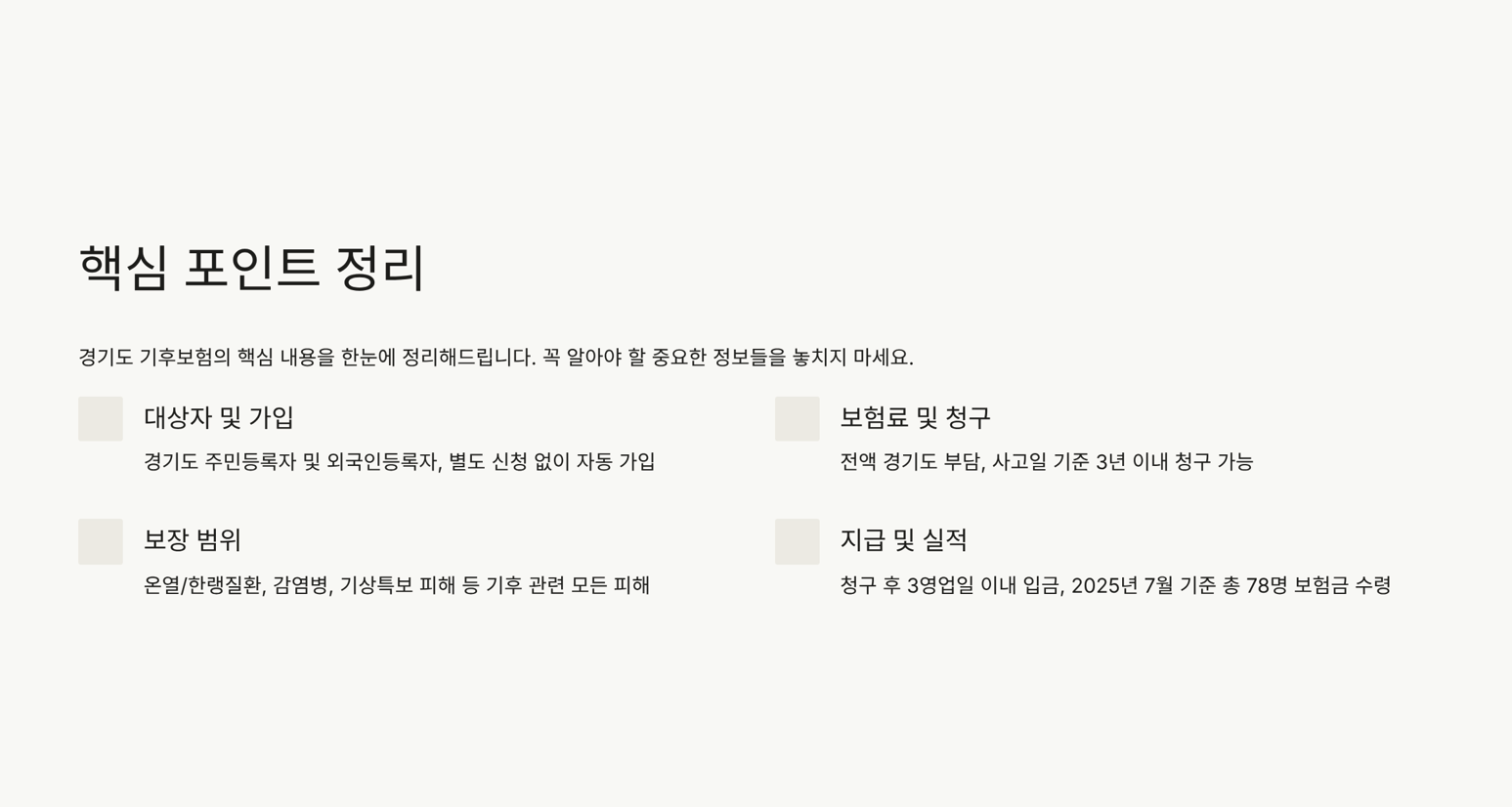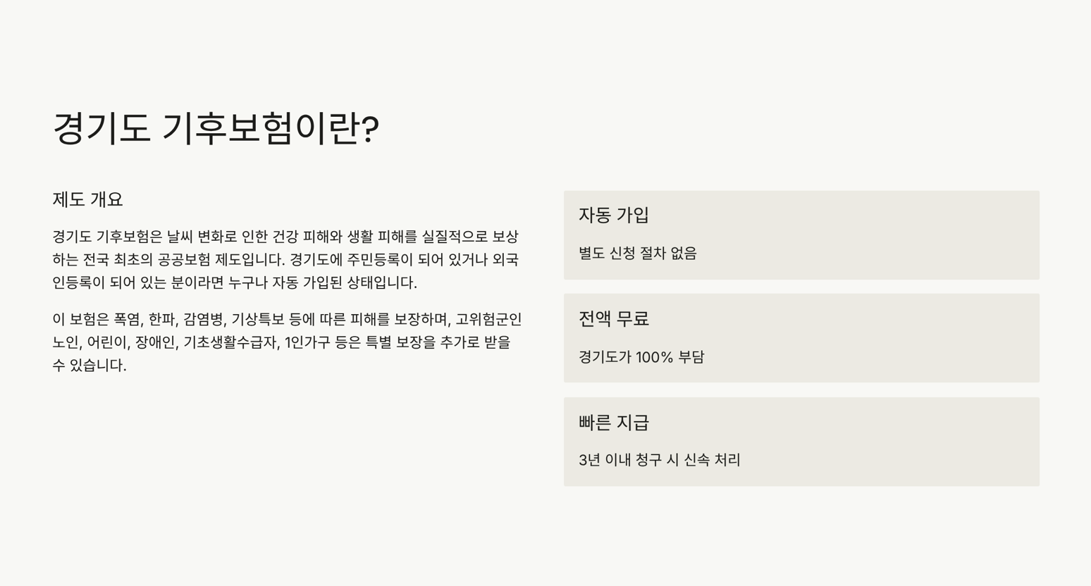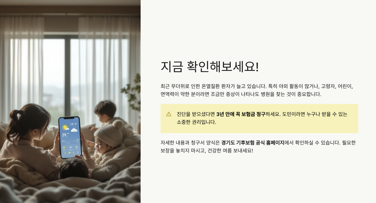 ‘경기도 기후보험’은 날씨 변화로 인한 건강 피해와 생활 피해를 실질적으로 보상하는 제도입니다.
