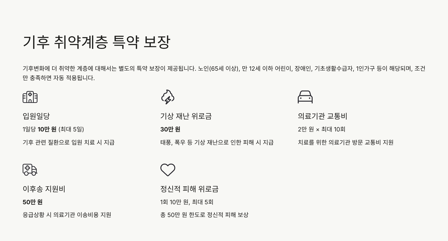 기후변화에 더 취약한 계층에 대해서는 별도의 특약 보장이 제공돼요.