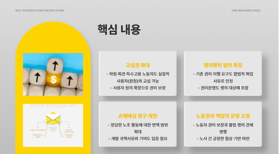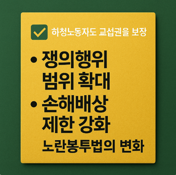 노란봉투법의 개정은 노동시장 구조뿐 아니라, 사회 전반의 권리·책임 균형 문화에 큰 영향을 미치고 있습니다.