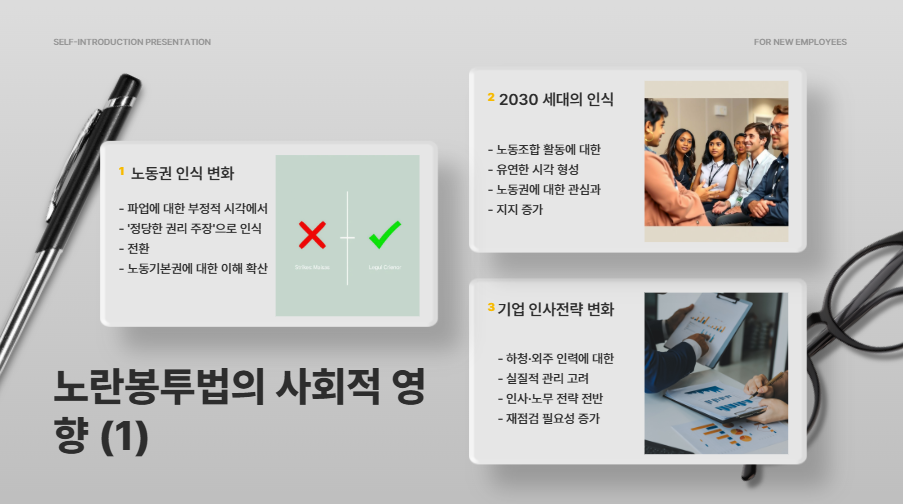 예전에는 '파업' 하면 무조건 부정적 인식이 우세했지만, 이제는 '정당한 권리 주장'이라는 시선이 확산되고 있어요. 특히 2030 세대를 중심으로 노동조합 활동에 대한 인식이 과거보다 훨씬 유연해졌습니다. - 기업의 인사 전략 변화