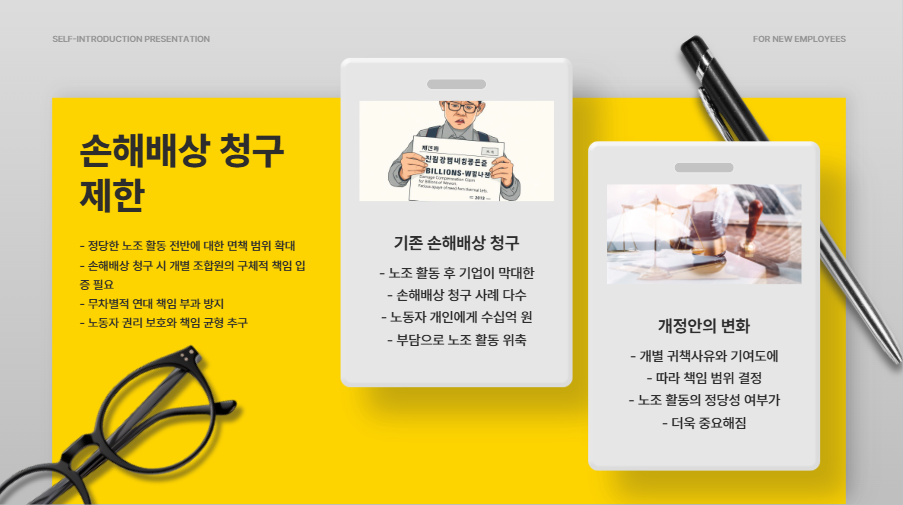 셋째, 노동조합의 정당한 활동에 대해서는 과도한 손해배상 청구를 제한하고, 청구 시에는 개별 귀책사유 입증을 요구합니다.