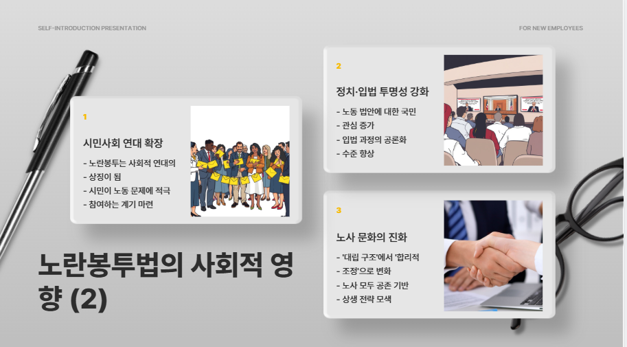 노동 법안 하나가 이토록 많은 주목을 받는다는 건, 국민들이 정치와 법의 연결에 더 관심을 가지게 되었다는 뜻입니다. 이는 향후 다양한 사회 현안에 대한 공론화 수준을 높이는 데 긍정적인 신호로 해석할 수 있어요. - 노사 문화의 진화