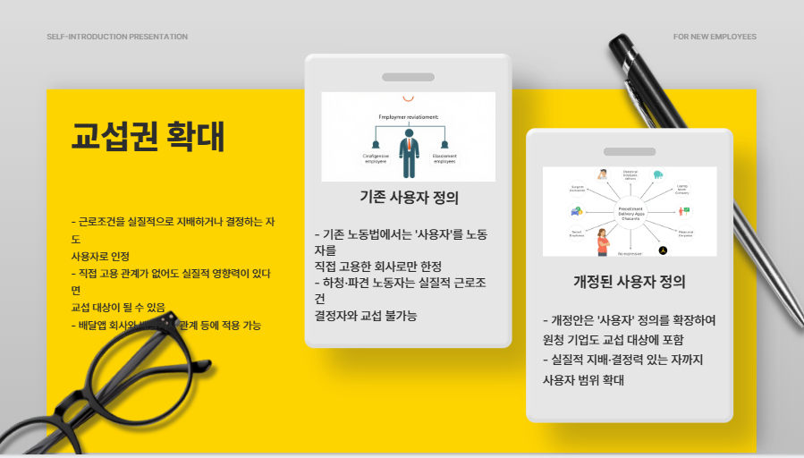 첫째, 하청·파견·특수고용 노동자들도 실질적 사용자(원청) 와 교섭할 수 있도록 법적 정의를 확장합니다.