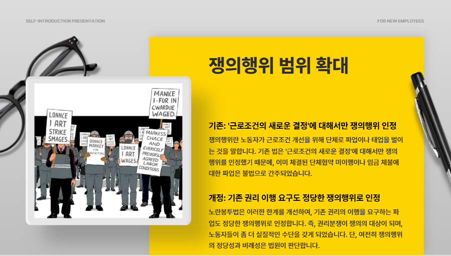 기존 법은 ‘근로조건의 새로운 결정’에 대해서만 쟁의행위를 인정했기 때문에, 이미 체결된 단체협약을 지키지 않거나 임금이 체불되더라도 파업이 불법으로 간주되곤 했습니다.