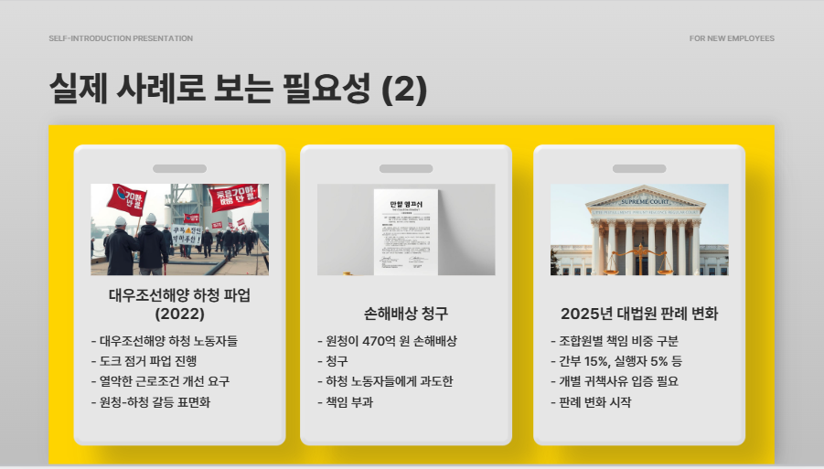 산별노조 간부가 한차례 발언한 것만으로 방조 책임 인정 → 조합원별 책임 비중(예: 간부 15%, 실행자 5%) 구분 → 법 개정 없이도 판례 변화가 시작됨