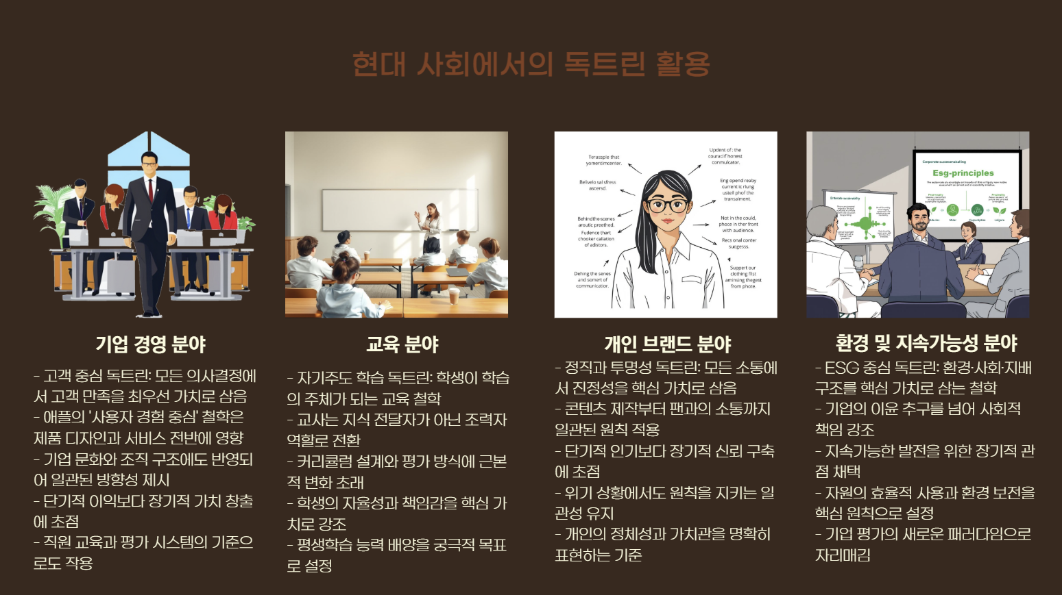 오늘날 ‘독트린’이라는 단어는 정치나 군사뿐 아니라, 기업 경영, 교육, 브랜드 전략 등 여러 분야에서 활용됩니다. 예를 들어,
