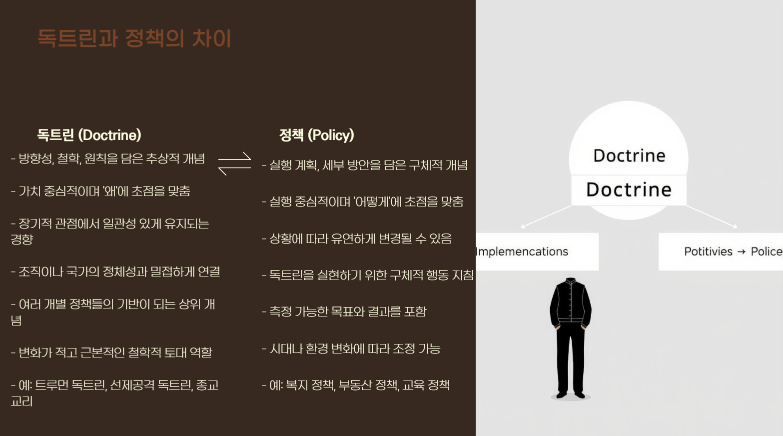 정리하자면, ‘독트린’은 방향성과 철학을 담은 원칙입니다.