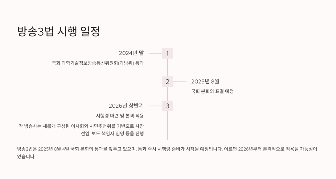 방송3법은 2025년 8월 4일 국회 본회의 통과를 앞두고 있으며, 통과 즉시 시행령 준비가 시작될 예정입니다.
