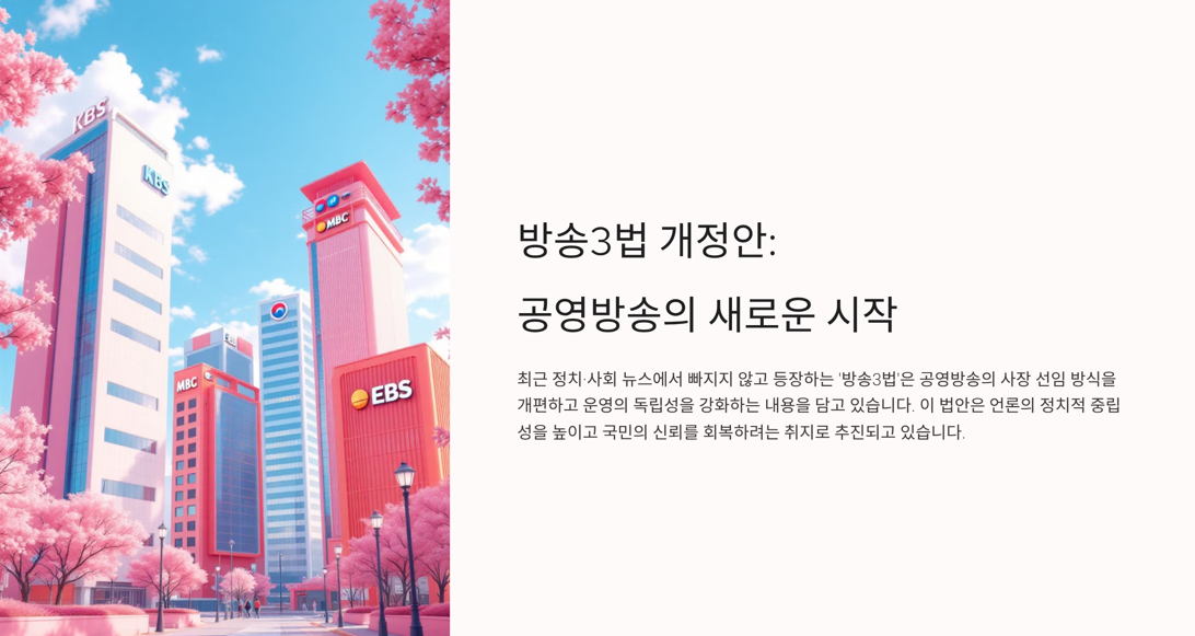 최근 정치·사회 뉴스에서 빠지지 않고 등장하는 단어 중 하나가 바로 ‘방송3법’이에요. 특히 KBS, MBC, EBS 같은 공영방송의 사장 선임 방식을 개편하고, 운영의 독립성을 강화하자는 내용이 핵심인데요.