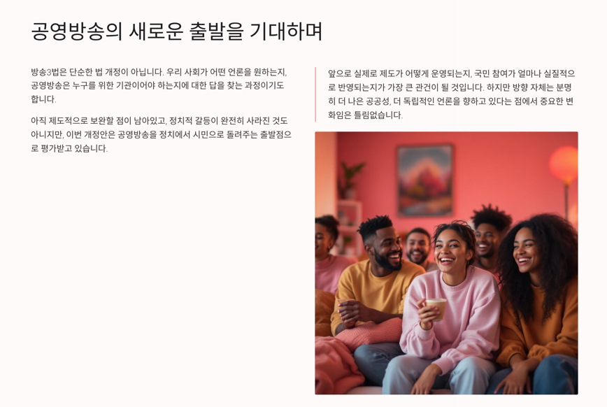하지만 방향 자체는 분명히 더 나은 공공성, 더 독립적인 언론을 향하고 있다는 점에서 중요한 변화임은 틀림없습니다.