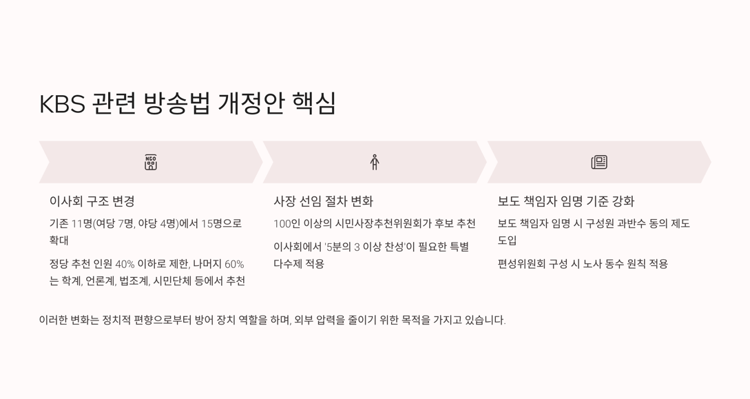 - 이사 추천권도 바뀌어요. 여야 정치권의 추천 비율은 줄이고, 학계·법조계·시민사회 등 외부 추천 인사 비중을 늘리는 방식입니다.
