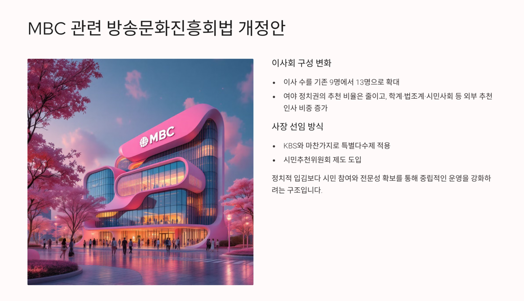 - 사장 선임은 KBS와 마찬가지로 특별다수제가 적용되고, 시민추천위원회 제도도 함께 도입돼요.