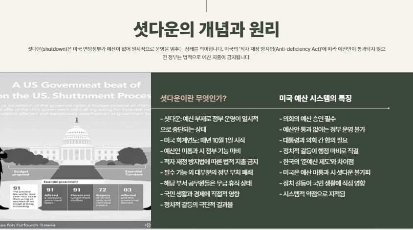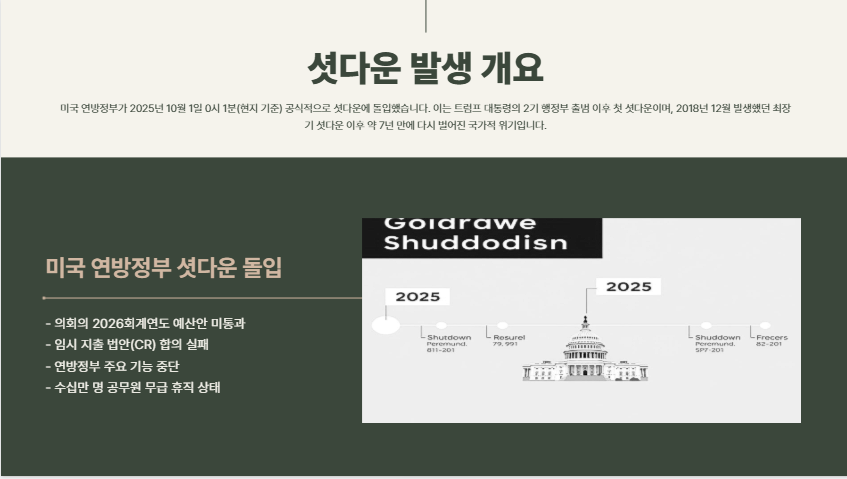 미국 연방정부가 2025년 10월 1일 0시 1분(현지 기준), 공식적으로 셧다운(shutdown)에 돌입했습니다.