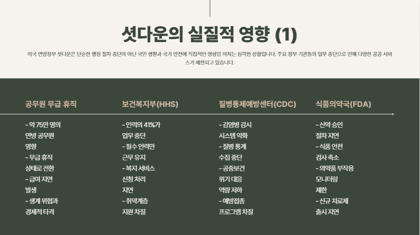 - 보건복지부(HHS): 인력의 41%가 업무 중단