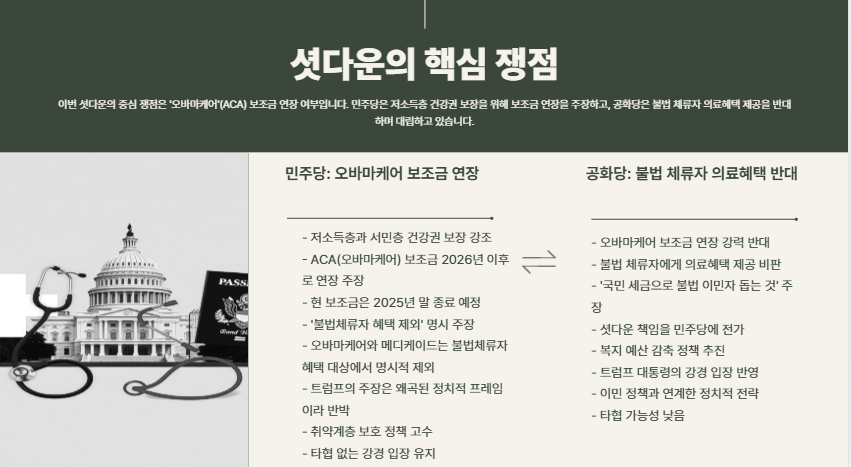 이번 셧다운의 중심 쟁점은 바로 ‘오바마케어’(ACA) 보조금 연장 여부입니다.