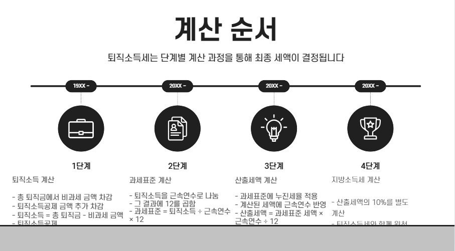 총 퇴직금, 근속연수, 공제액 등을 모두 고려한 뒤 몇 단계에 걸쳐 계산되며, 다음과 같은 흐름을 따릅니다.