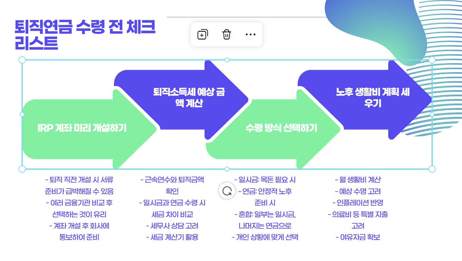 노후는 저절로 준비되지 않아요. 지금부터 하나하나 챙기면, 퇴직 후에도 걱정 없이 생활할 수 있습니다.