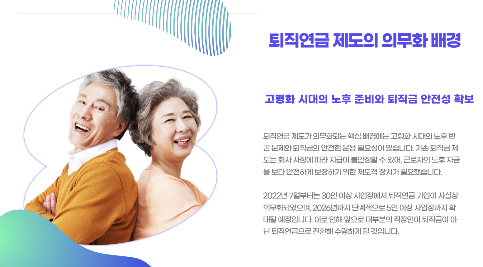 - 2022년 7월부터 상시 근로자 30인 이상 사업장은 퇴직연금 가입이 사실상 의무화됐습니다.