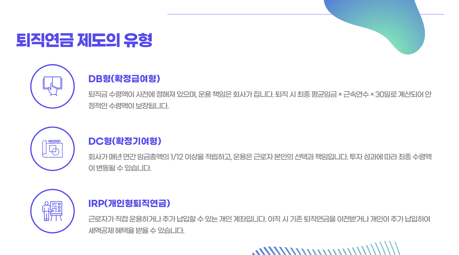 퇴직연금은 아래 세 가지 유형으로 구분됩니다.