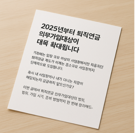 👉 지금 바로 내 사업장이 퇴직연금 의무가입대상인지 확인하고, 준비를 시작하세요.