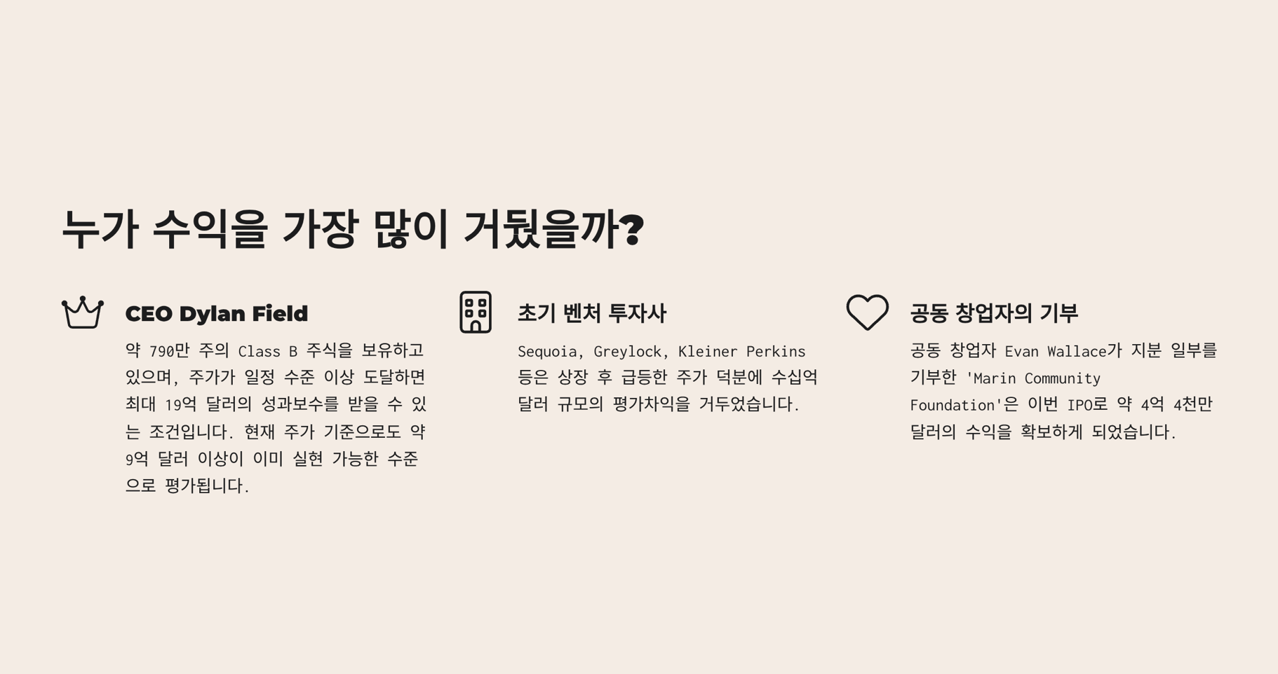 | 수익자 | CEO, 초기 투자사, 기부재단 등 대규모 수익 실현 |