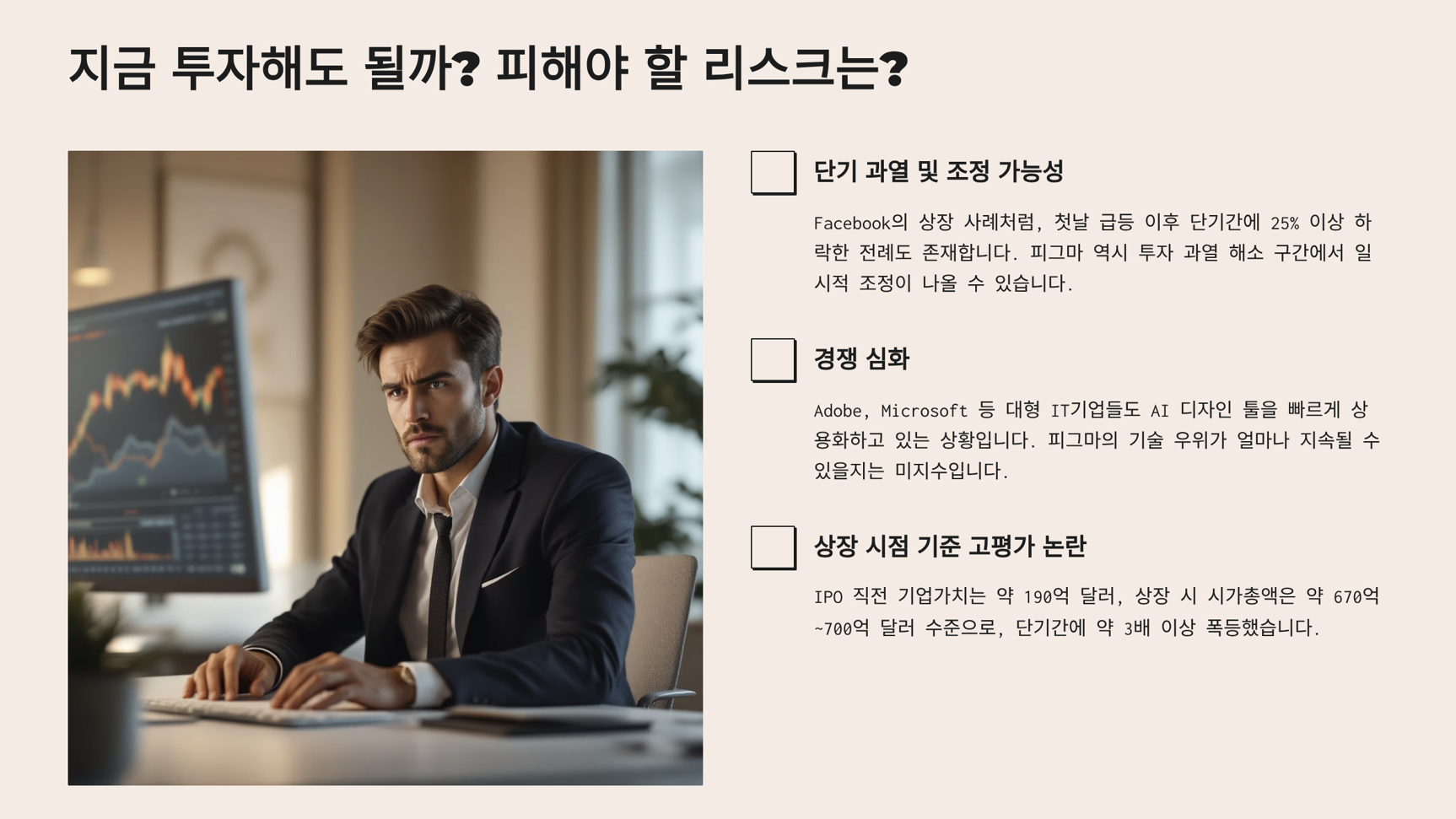 Facebook의 상장 사례처럼, 첫날 급등 이후 단기간에 25% 이상 하락한 전례도 존재합니다. 피그마 역시 투자 과열 해소 구간에서 일시적 조정이 나올 수 있습니다. - 경쟁 심화