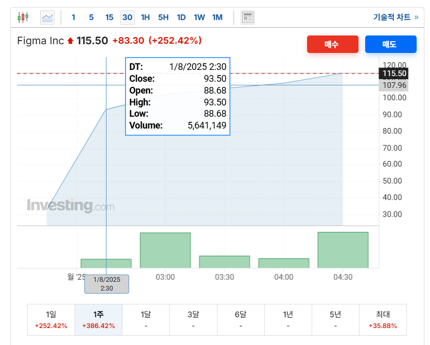 첫날 시초가는 $85, 종가는 무려 $115.50에 마감되며 공모가 대비 약 250% 상승을 기록했습니다.