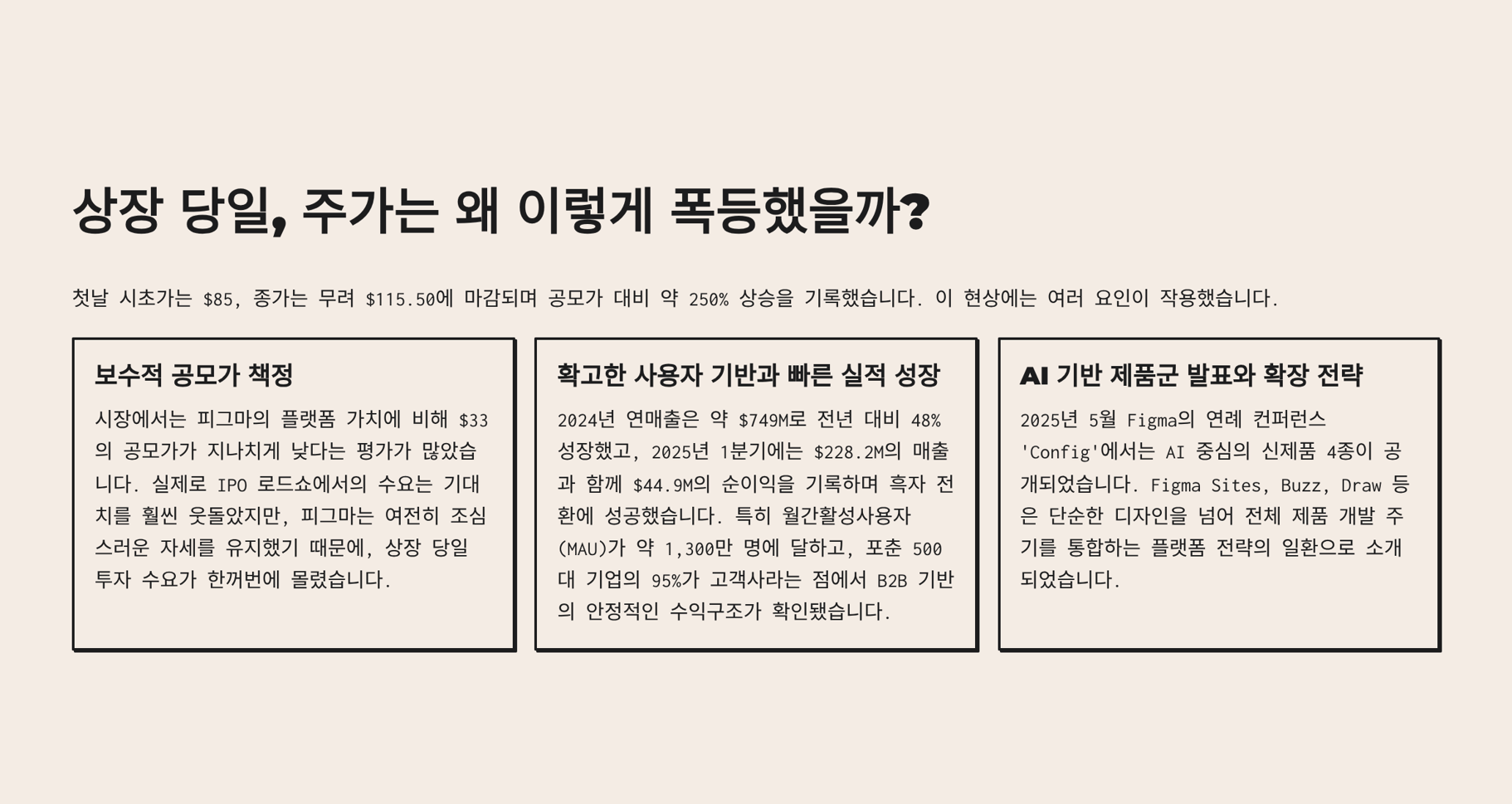 시장에서는 피그마의 플랫폼 가치에 비해 $33의 공모가가 지나치게 낮다는 평가가 많았습니다. 실제로 IPO 로드쇼에서의 수요는 기대치를 훨씬 웃돌았지만, 피그마는 여전히 조심스러운 자세를 유지했기 때문에, 상장 당일 투자 수요가 한꺼번에 몰렸습니다. - 확고한 사용자 기반과 빠른 실적 성장