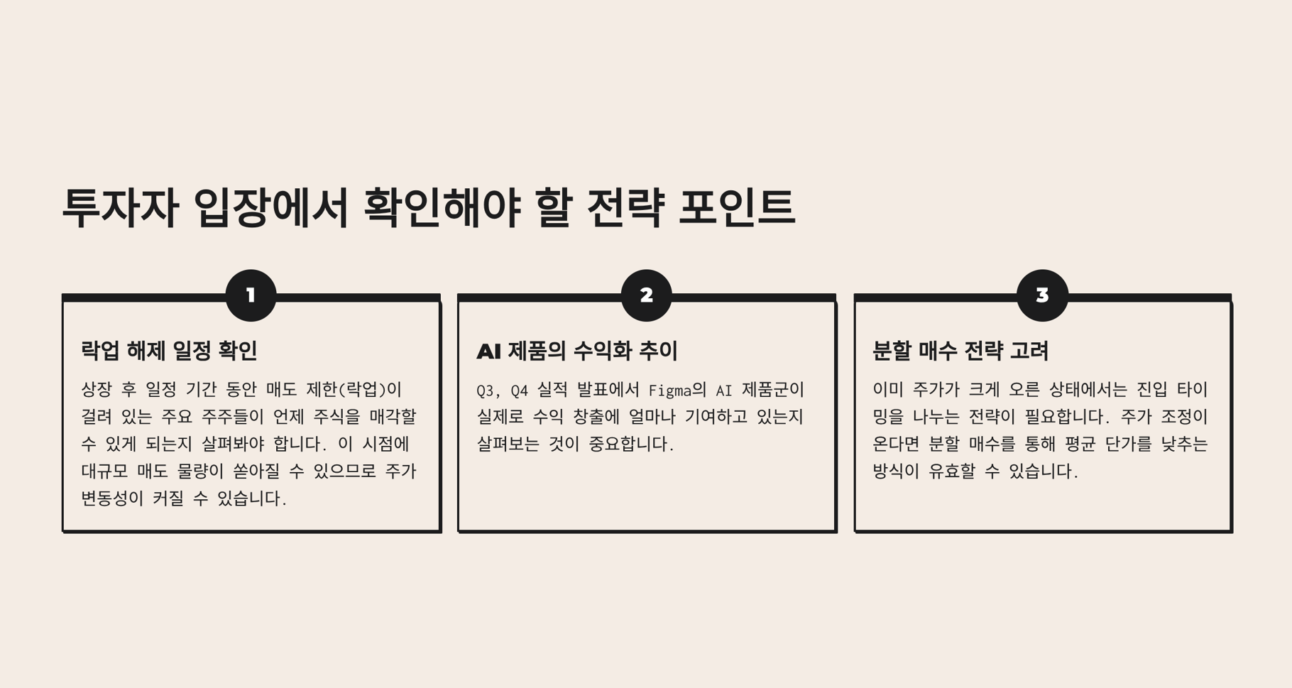 Q3, Q4 실적 발표에서 Figma의 AI 제품군이 실제로 수익 창출에 얼마나 기여하고 있는지 살펴보는 것이 중요합니다. - 분할 매수 전략 고려