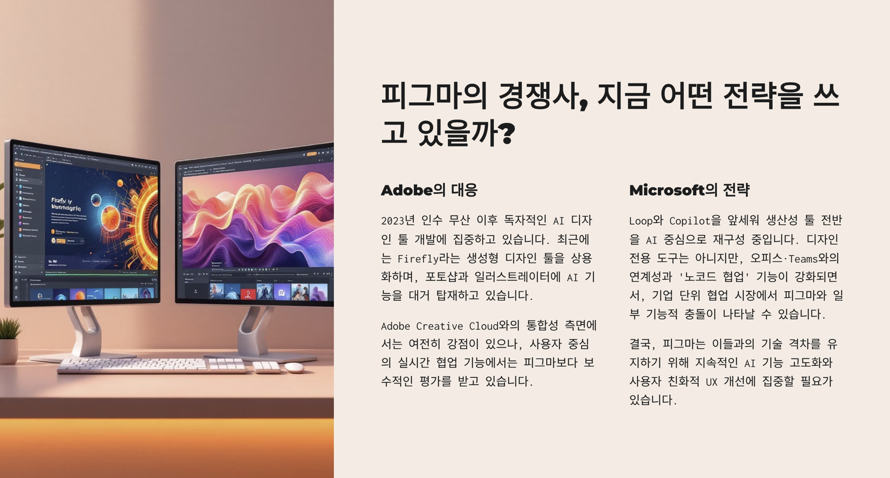 - Adobe는 2023년 인수 무산 이후 독자적인 AI 디자인 툴 개발에 집중하고 있습니다.