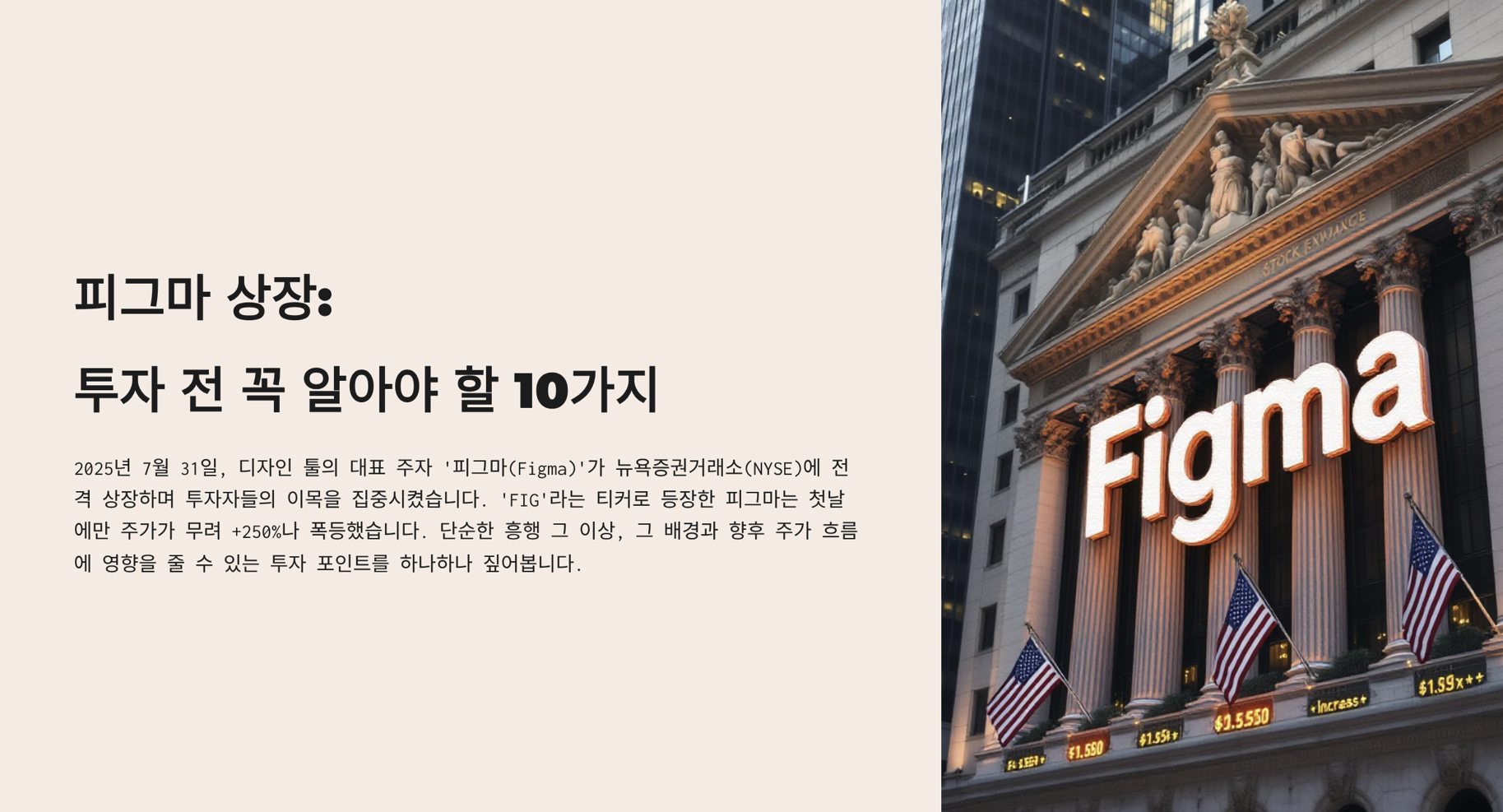 2025년 7월 31일, 디자인 툴의 대표 주자 ‘피그마(Figma)’가 뉴욕증권거래소(NYSE)에 전격 상장하며 투자자들의 이목을 집중시켰습니다. ‘FIG’라는 티커로 등장한 피그마는 첫날에만 주가가 무려 +250%나 폭등했는데요. 단순한 흥행 그 이상, 그 배경과 향후 주가 흐름에 영향을 줄 수 있는 투자 포인트를 하나하나 짚어봅니다.