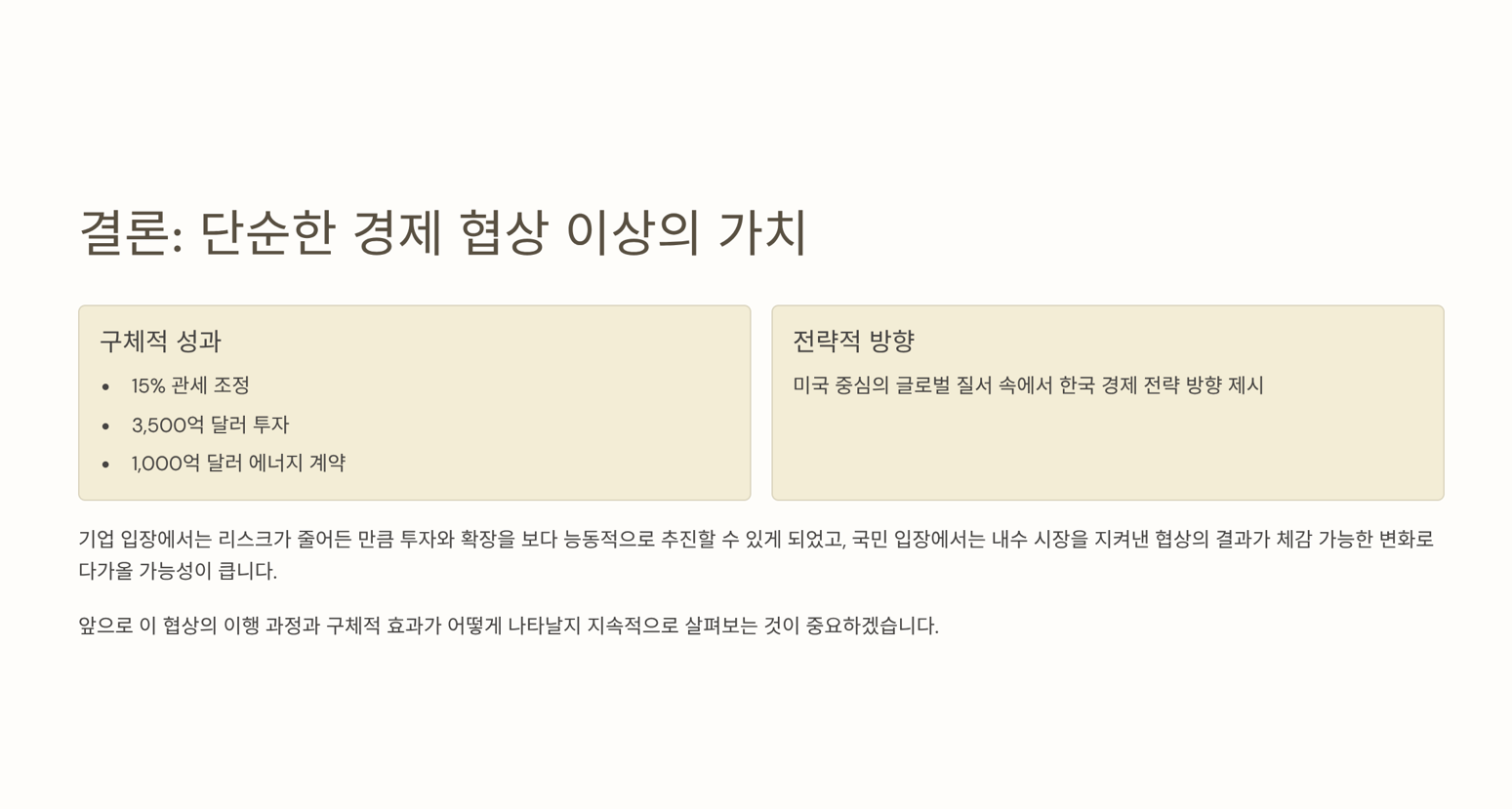 이번 한미 관세 협상은 단순한 관세 인하 이상의 의미를 담고 있습니다. 15% 관세 조정, 3,500억 달러 투자, 1,000억 달러 에너지 계약이라는 구체적인 결과물은, 향후 한국 경제가 미국 중심의 글로벌 질서 속에서 어떻게 전략을 세워야 하는지 방향을 제시하고 있어요.