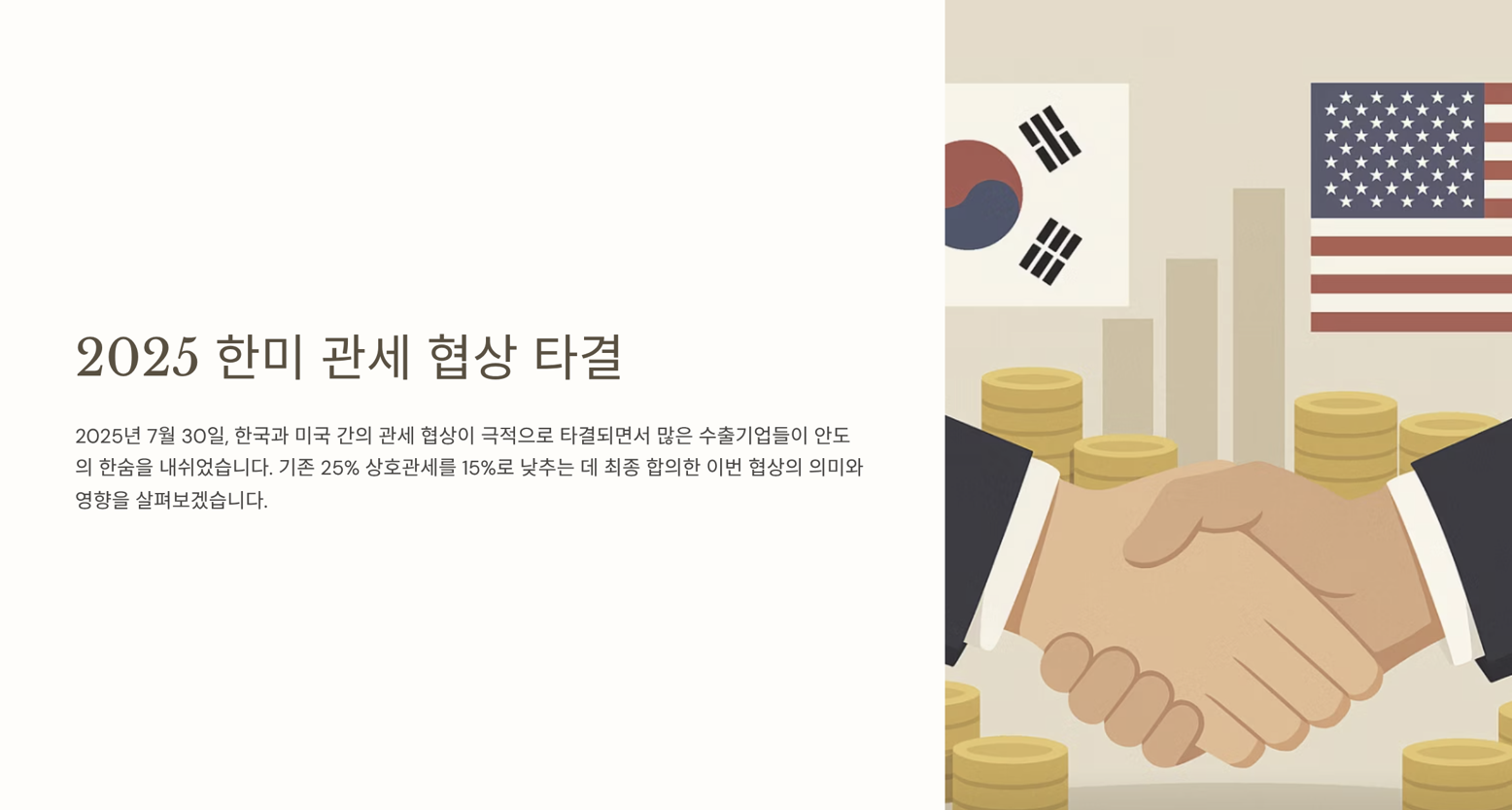 2025년 7월 30일, 한국과 미국 간의 관세 협상이 극적으로 타결되면서 많은 수출기업들이 안도의 한숨을 내쉬었습니다. 기존에 예정되어 있던 25%의 상호관세를 15%로 낮추는 데 최종 합의했기 때문인데요. 이번 협상이 왜 중요한지, 어떤 내용이 포함되었는지, 그리고 한국 경제 전반에 어떤 영향을 미칠지 자세히 알아보겠습니다.
