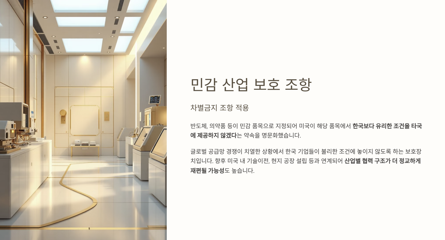 반도체, 의약품 등은 '차별금지 조항'이 포함된 민감 품목으로 지정되었어요. 이 말은 미국이 해당 품목에서 한국보다 유리한 조건을 타국에 제공하지 않겠다는 약속을 명문화한 것이죠.