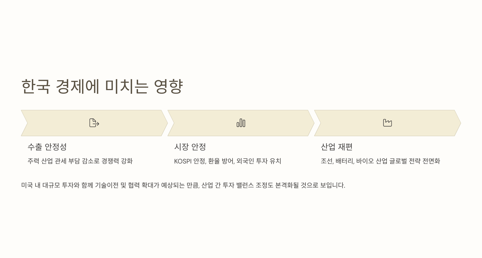 이번 관세 인하는 수출 안정성 확보 측면에서 상당한 의미가 있습니다. 자동차, 반도체, 철강 등 기존 주력 산업의 관세 부담이 줄어든 만큼, KOSPI 안정, 환율 방어, 외국인 투자 유치 등 간접적 효과도 기대되고 있어요.