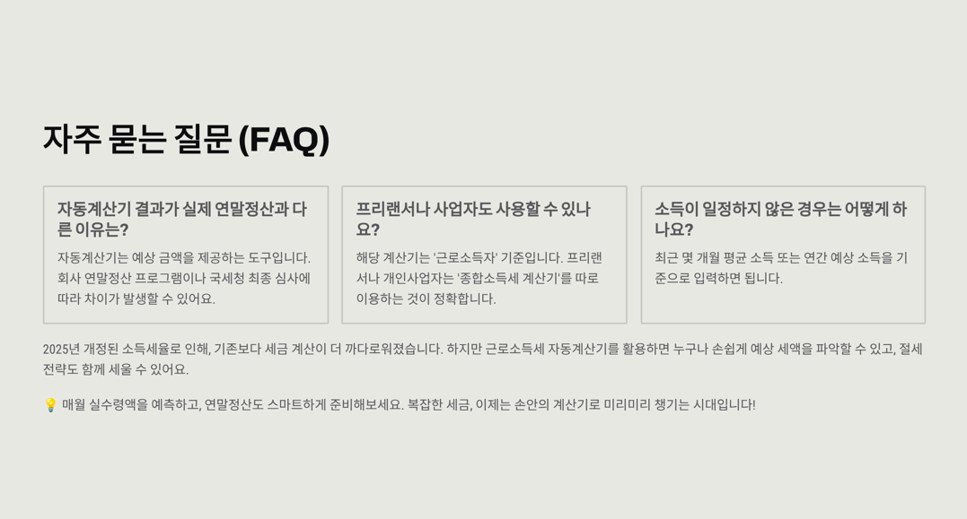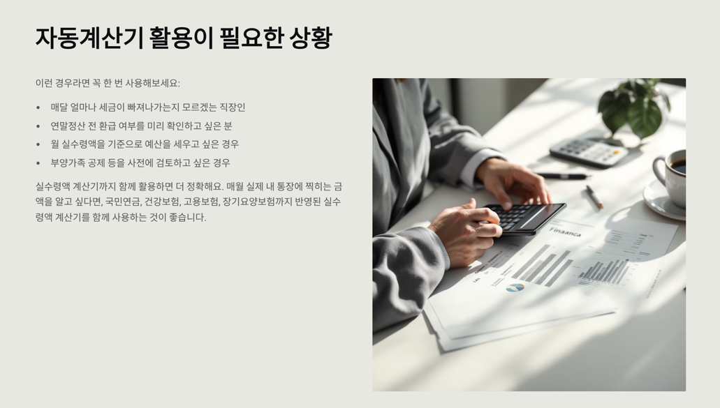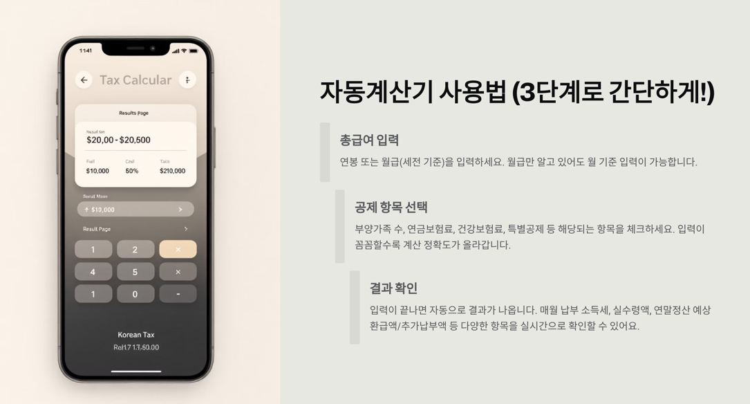 사용자 입장에서는 번거로운 공식이나 세율표를 몰라도 손쉽게 예상 세금과 실수령액을 확인할 수 있어서 아주 편리해요.