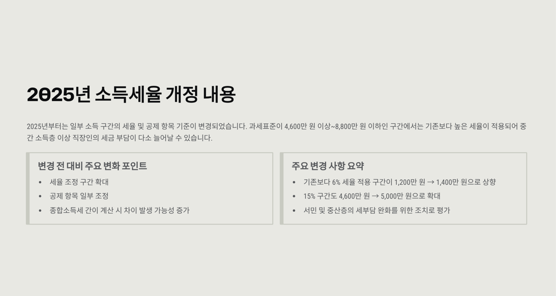 2025년부터는 일부 소득 구간의 세율 및 공제 항목 기준이 변경되었습니다.