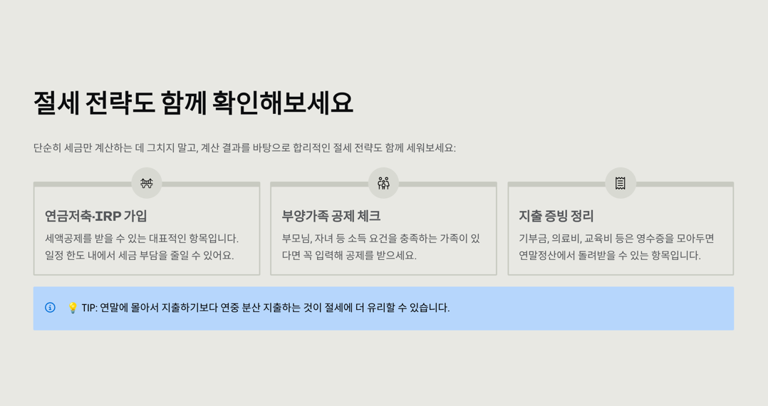단순히 세금만 계산하는 데 그치지 말고, 계산 결과를 바탕으로 합리적인 절세 전략도 함께 세워보세요: