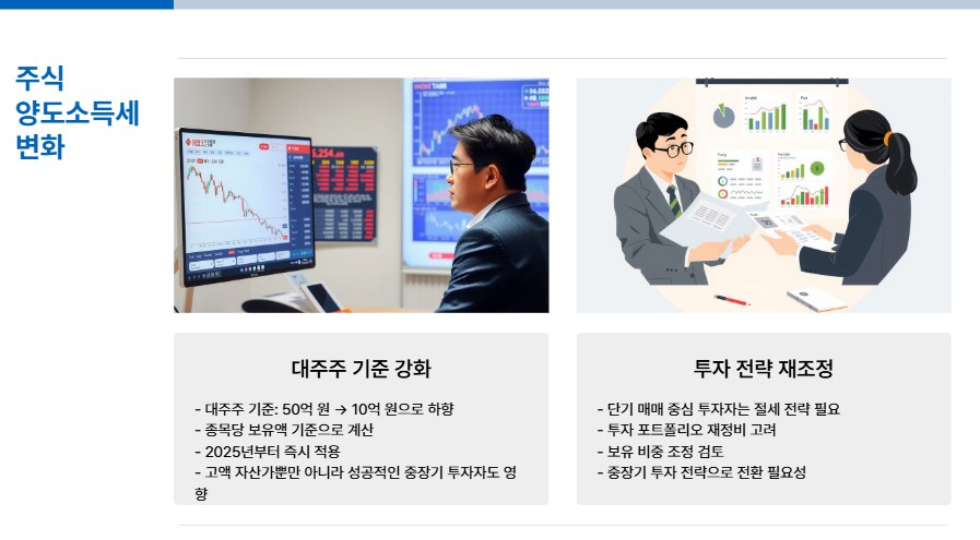 바로 양도소득세 부과 기준인 ‘대주주’ 요건이 강화됐다는 점인데요. 기존에는 특정 종목을 50억 원 이상 보유해야 대주주로 간주됐지만, 2025년부터는 10억 원만 초과해도 과세 대상이 됩니다.