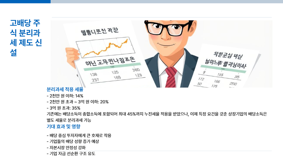 이번 개편안에서 가장 눈길을 끈 항목 중 하나는 고배당 상장기업의 배당소득 분리과세 제도 도입이에요.