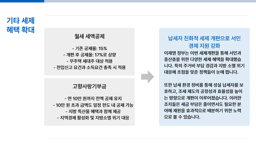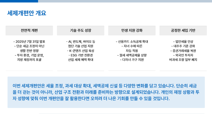 오늘은 이재명 정부가 발표한 2025년 세제개편안의 핵심 내용을 분야별로 쉽게 정리해 드릴게요.
