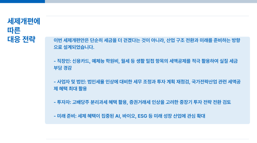 2025년 세제개편안은 단순히 세금을 더 걷겠다는 것이 아니라, 산업 구조 전환과 미래를 준비하는 방향으로 짜여진 변화예요.