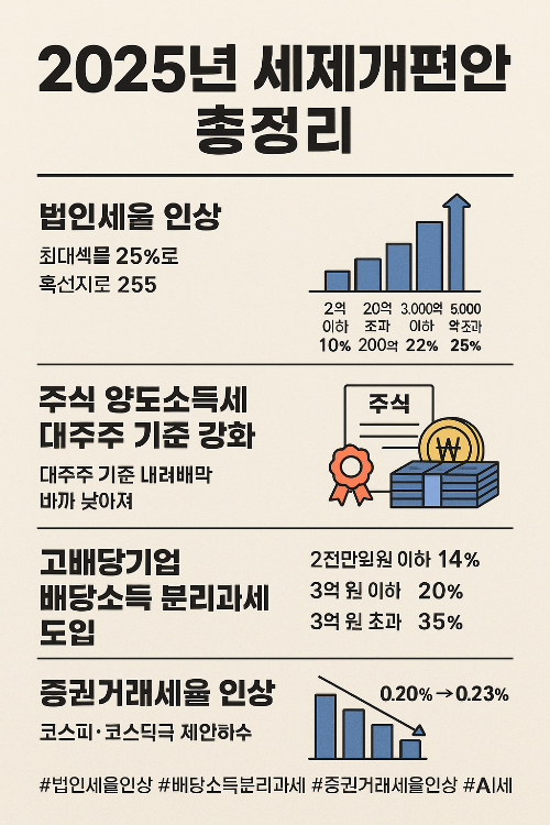 ‘기술 주도 성장’, ‘민생 지원 강화’, ‘공정한 세입 기반’이라는 세 가지 축을 중심으로 진행된 이번 세제개편은 세율 조정, 과세 대상 확대, 세액공제 신설 등 다양한 변화가 담겼습니다. 특히 법인세 인상, 고배당 분리과세 도입, 증권거래세율 복원, 신용카드 공제 확대 등은 많은 분들의 세금 전략에 직접적인 영향을 줄 수 있어요.