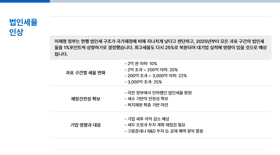 이재명 정부는 현행 법인세 구조가 국가재정에 비해 지나치게 낮다고 판단하고, 2025년부터 모든 과표 구간의 법인세율을 1%포인트씩 상향하기로 결정했어요.