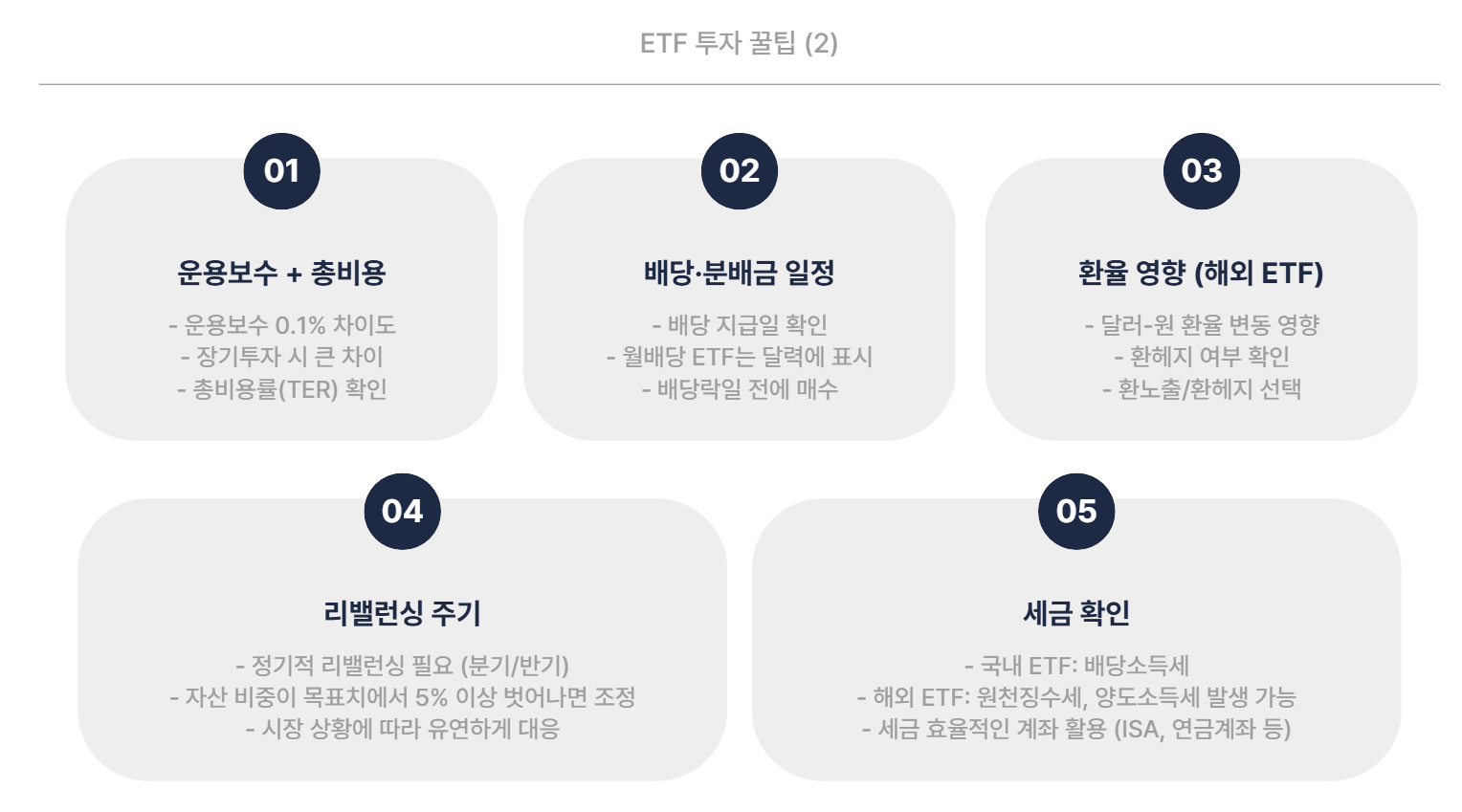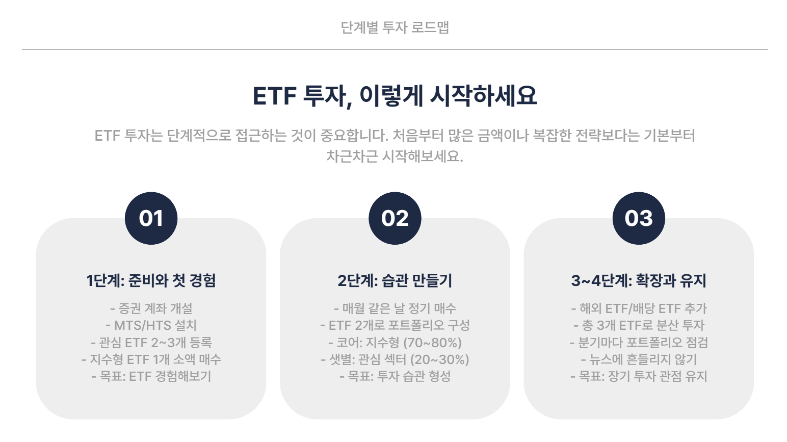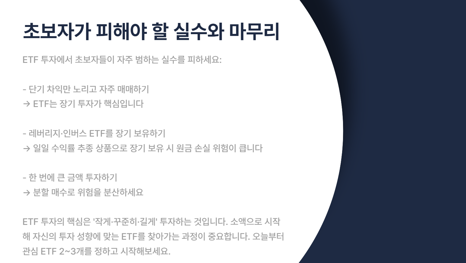 👉 이런 습관은 피하고, “작게·꾸준히·길게” 가 ETF의 본질입니다.
